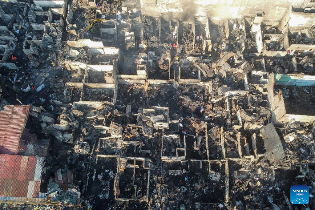 This aerial drone photo taken on Feb. 26, 2026 shows a scene after a residential fire at a slum area in Manila, the Philippines. (Xinhua/Rouelle Umali)