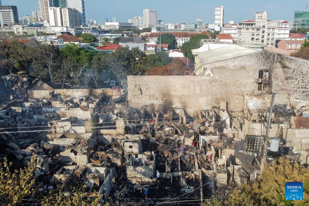 This aerial drone photo taken on Feb. 26, 2026 shows a scene after a residential fire at a slum area in Manila, the Philippines. Firefighters on Wednesday placed under control a blaze that tore through a residential area in Manila City, Philippines, forcing the evacuation of hundreds of families and destroying dozens of houses.
