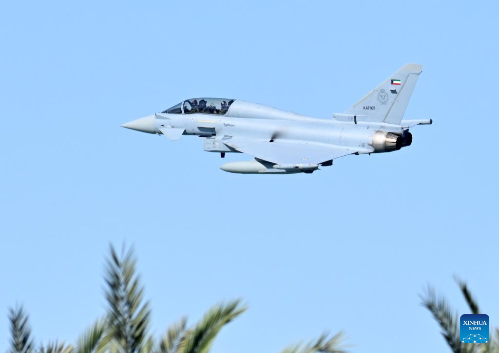 A Eurofighter Typhoon flies over Kuwait City in celebration of Kuwait's National Day and Liberation Day, in Kuwait, Feb. 25, 2026. (Photo by Asad/Xinhua)