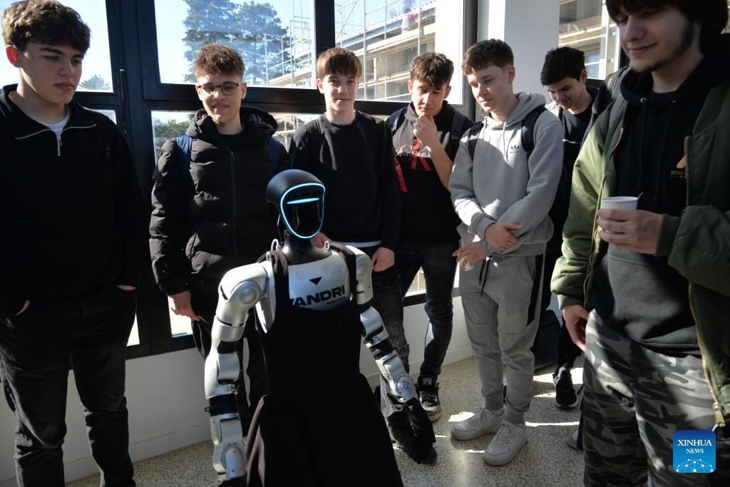 Students view humanoid robot Tonka in Zagreb, Croatia, on Feb. 25, 2026. Humanoid robot Tonka, capable of performing fluid dance routines and Kung Fu-inspired movements, was unveiled on Wednesday at the Rudjer Boskovic Institute during the conference on humanoid robotics.