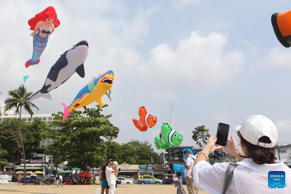 This photo taken on Feb. 25, 2026 shows kites flying above a beach in Pattaya, Thailand. Pattaya International Kite On The Beach 2026 kicked off here on Wednesday and will last until March 1. (Xinhua/Rachen Sageamsak)