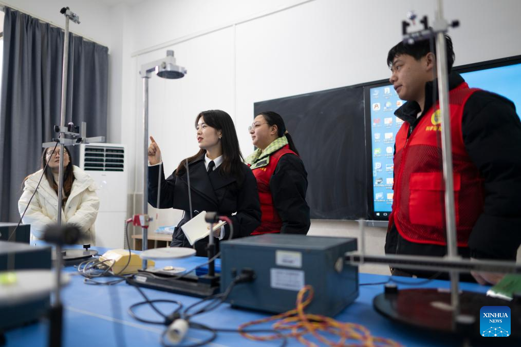 Zhang Qiongli (2nd L) talks with members of science volunteer service team from the Physics Department of Hubei Minzu University in Enshi Tujia and Miao Autonomous Prefecture, central China's Hubei Province, Feb. 4, 2026. Zhang, in cooperation with the team, actively carries out science popularization plus ideological and political education activities targeting teachers and students from primary, secondary, and higher education institutions. (Xinhua/Wu Zhizun)