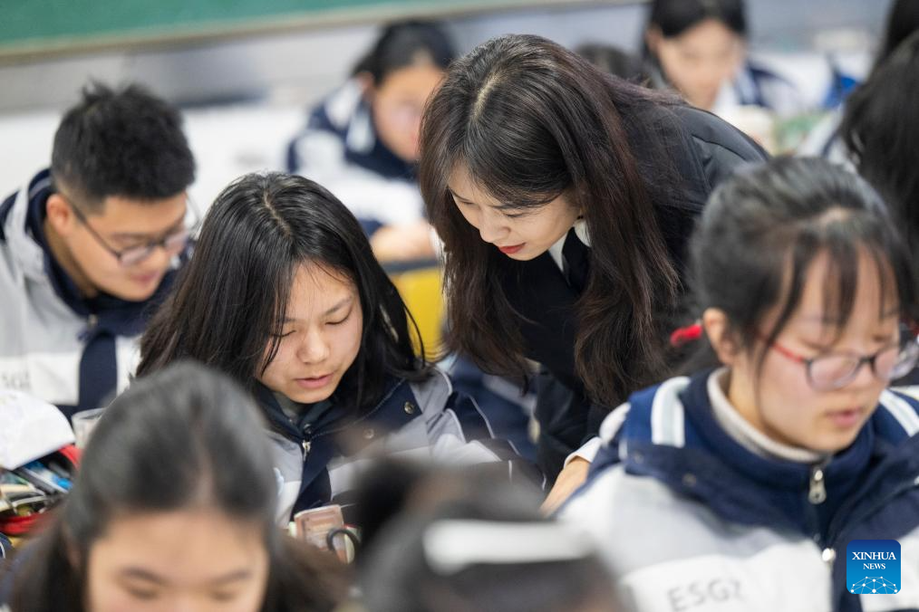 Zhang Qiongli instructs students at Enshi Tujia and Miao Autonomous Prefecture Senior High School in Enshi, central China's Hubei Province, Feb. 4, 2026. (Xinhua/Wu Zhizun)