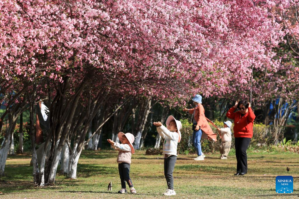 Tourists view flowering crabapple trees in Zhanyi District of Qujing, southwest China's Yunnan Province, on Feb. 26, 2026. (Photo by Sun Wenlai/Xinhua)