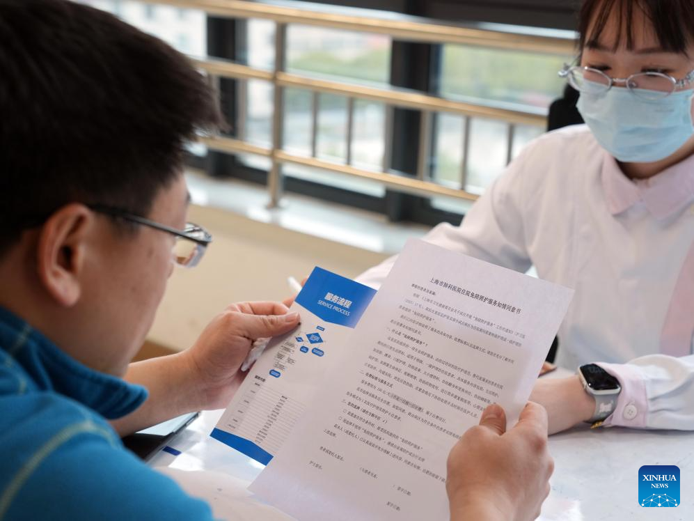 A family member of an inpatient learns about the "companion-free" care services at a hospital in Shanghai, east China, Feb. 26, 2026.(Xinhua/Liu Ying)