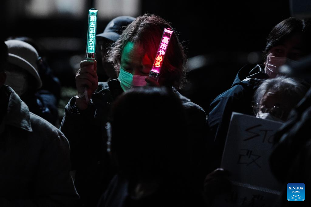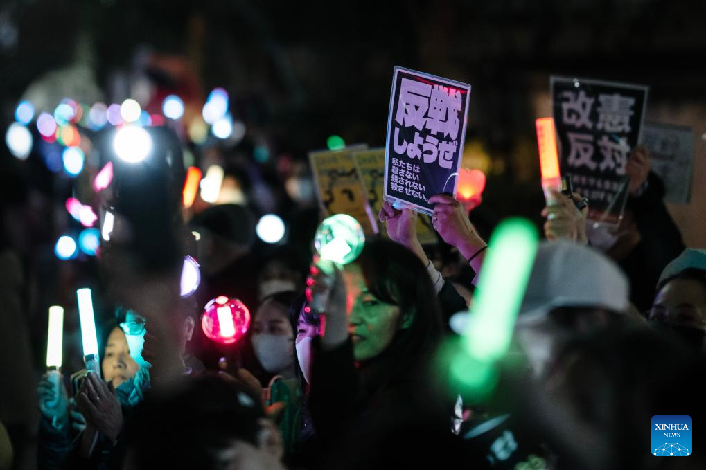 TOKYO, Feb. 28 (Xinhua) -- Large numbers of Japanese citizens gathered on Friday evening in Tokyo to protest Prime Minister Sanae Takaichi's attempt to revise the country's pacifist Constitution.