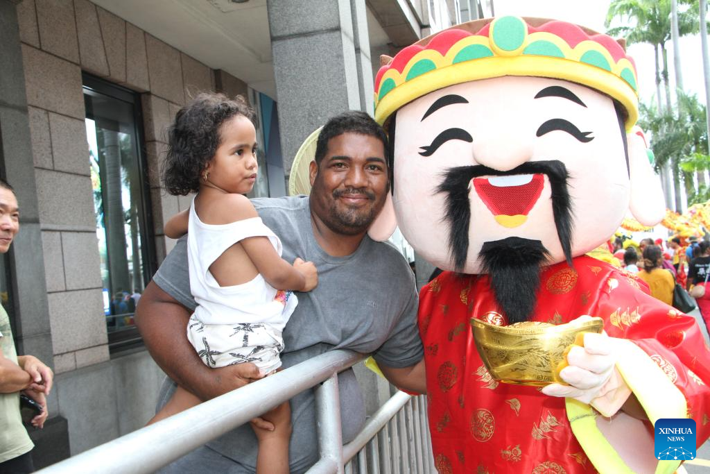 Spectators pose for photos with a performer taking part in a float parade marking the Spring Festival in Port Louis, Mauritius, Feb. 28, 2026. The parade, jointly organized by the Chinese Embassy in Mauritius, the China Cultural Center in Mauritius, the Municipality of Port Louis and the United Chinese Associations, was held in a festive and sharing atmosphere in Port Louis on Saturday. (Photo by Ally Soobye/Xinhua)