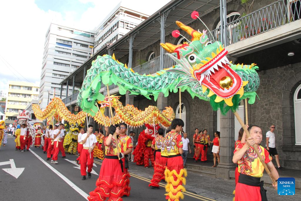 A dragon and lion dance is staged during a float parade marking the Spring Festival in Port Louis, Mauritius, Feb. 28, 2026. The parade, jointly organized by the Chinese Embassy in Mauritius, the China Cultural Center in Mauritius, the Municipality of Port Louis and the United Chinese Associations, was held in a festive and sharing atmosphere in Port Louis on Saturday. (Photo by Ally Soobye/Xinhua)