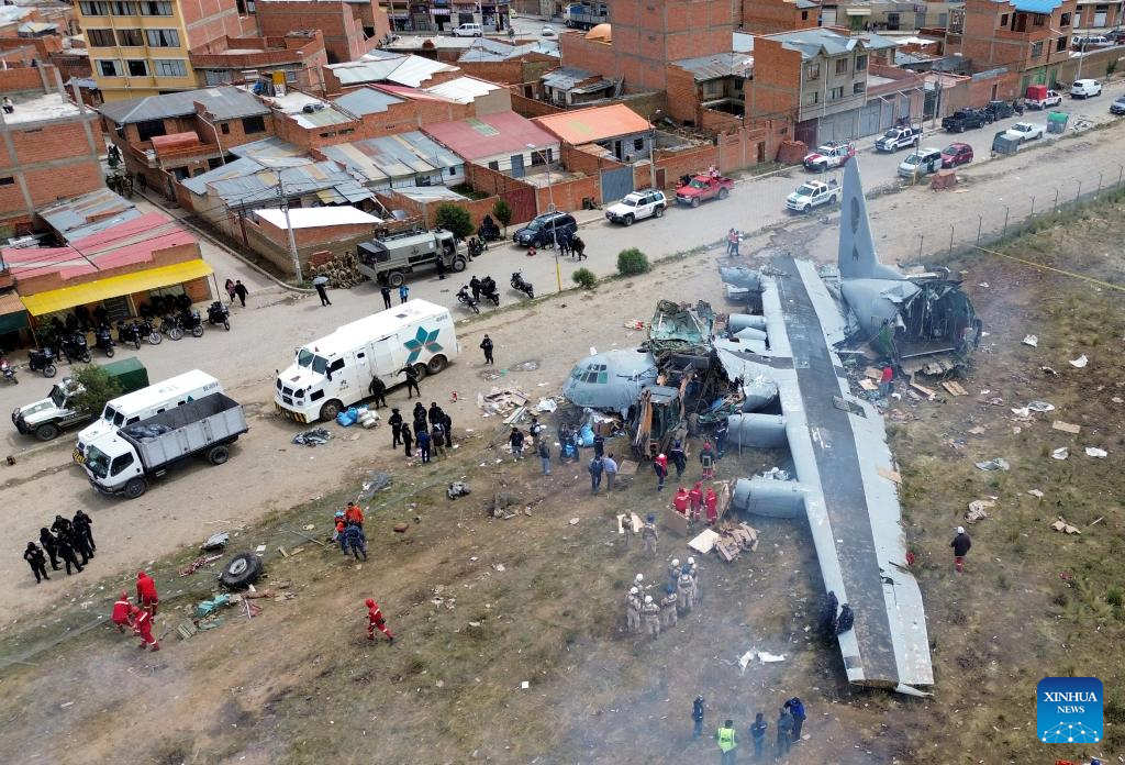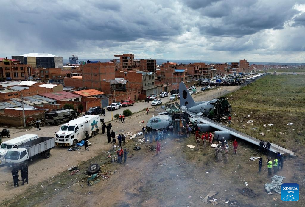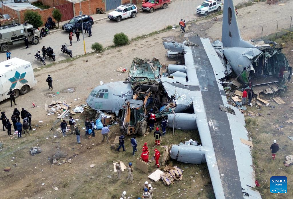 The crash occurred Friday night when a Bolivian Air Force Hercules C-130 military aircraft veered off the runway upon landing at El Alto International Airport and collided with public roads. Dozens were injured and about 20 vehicles, including public transport, were destroyed. (Photo by Javier Mamani/Xinhua)