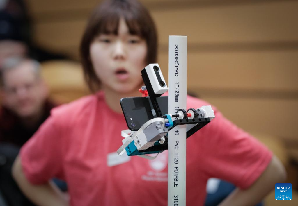 A student fine-tunes a robotic pole climber during the 48th annual Physics Olympics at the University of British Columbia in Vancouver, British Columbia, Canada, on Feb. 28, 2026. More than 1,000 high school students from across the Canadian province of British Columbia participated in the 48th annual Physics Olympics held here on Saturday. (Photo by Liang Sen/Xinhua)