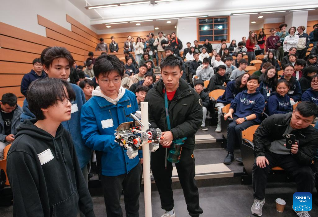 Students look at a robotic pole climber in action during the 48th annual Physics Olympics at the University of British Columbia in Vancouver, British Columbia, Canada, on Feb. 28, 2026. More than 1,000 high school students from across the Canadian province of British Columbia participated in the 48th annual Physics Olympics held here on Saturday. (Photo by Liang Sen/Xinhua)