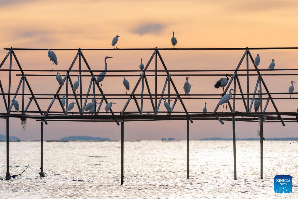 Birds rest on a rack at Lake Victoria, in Kisumu, Kenya, Feb. 27, 2026. Kisumu, located on the shores of Lake Victoria in western Kenya, stands as the country's third-largest city. (Xinhua/Yan Yujing)