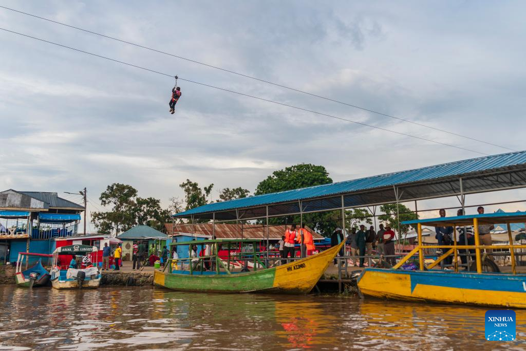A tourist rides a zipline over a port at the shore of Lake Victoria in Kisumu, Kenya, Feb. 27, 2026. Kisumu, located on the shores of Lake Victoria in western Kenya, stands as the country's third-largest city. (Xinhua/Xie Jianfei)