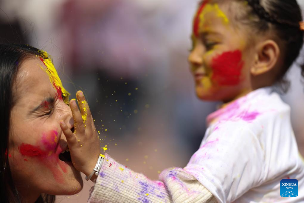 A girl and a woman smeared with colored powder are pictured during a celebration of the Holi Festival in Kathmandu, Nepal, on March 2, 2026. Holi, the festival of colors, marks the end of winter and the onset of the spring season. (Photo by Sulav Shrestha/Xinhua)