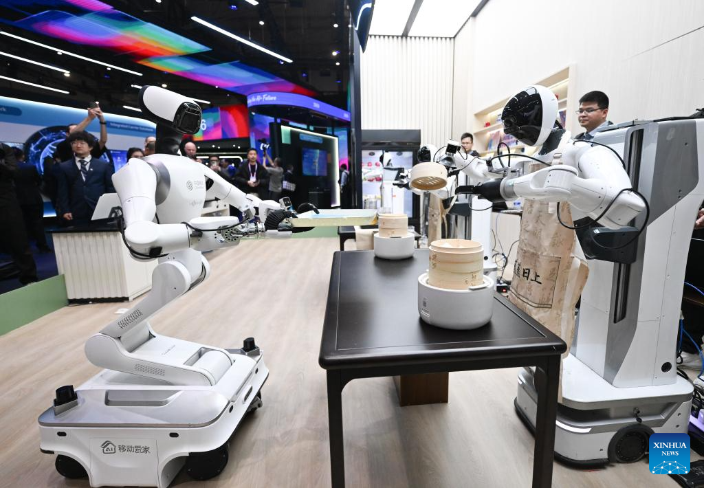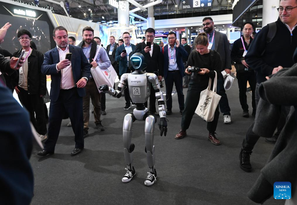 People view robots displayed at the booth of China Mobile during the 2026 Mobile World Congress (MWC) in Barcelona, Spain, March 2, 2026. The 2026 MWC opened on Monday in Barcelona, Spain, under the theme "The IQ Era," with a focus on intelligent infrastructure, AI connectivity and integration, enterprise-level AI applications, AI ecosystem collaboration, inclusive technology and innovation-driven transformation. (Xinhua/Cheng Min)