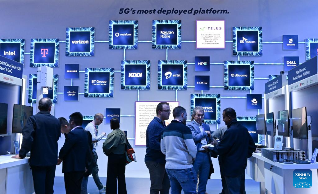 People visit the booth of Intel during the 2026 Mobile World Congress (MWC) in Barcelona, Spain, March 2, 2026. The 2026 MWC opened on Monday in Barcelona, Spain, under the theme "The IQ Era," with a focus on intelligent infrastructure, AI connectivity and integration, enterprise-level AI applications, AI ecosystem collaboration, inclusive technology and innovation-driven transformation. (Xinhua/Cheng Min)