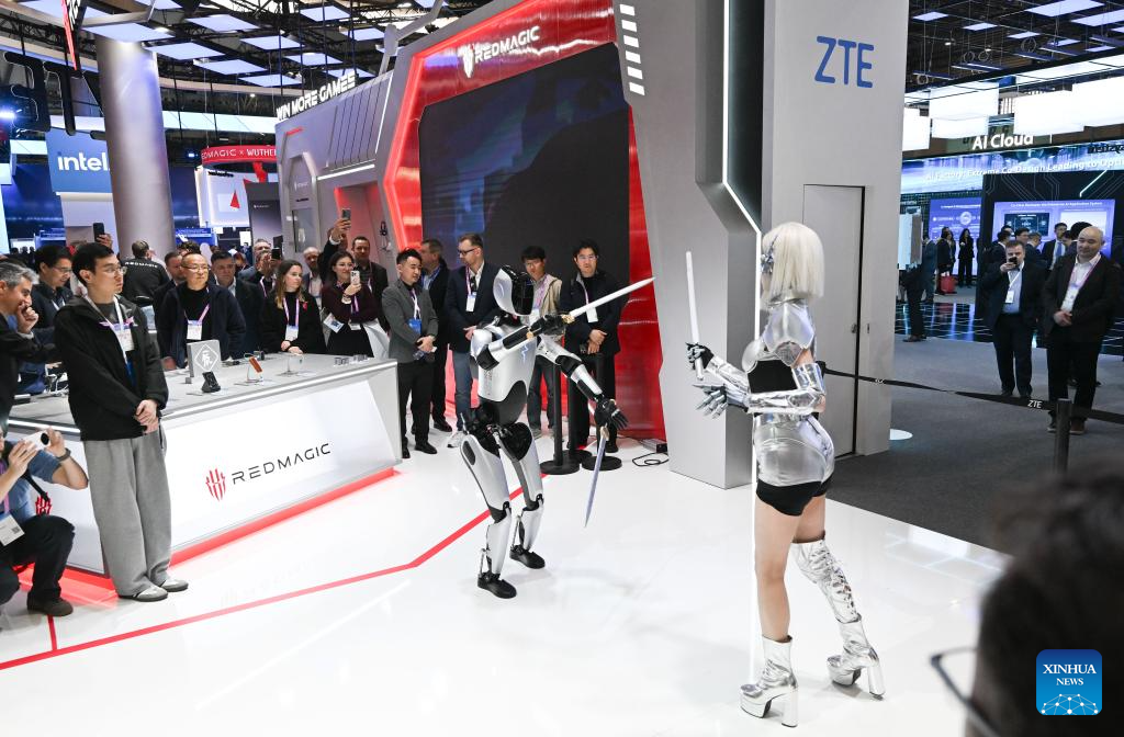 People watch a performance by a robot and a woman at the booth of ZTE during the 2026 Mobile World Congress (MWC) in Barcelona, Spain, March 2, 2026. The 2026 MWC opened on Monday in Barcelona, Spain, under the theme "The IQ Era," with a focus on intelligent infrastructure, AI connectivity and integration, enterprise-level AI applications, AI ecosystem collaboration, inclusive technology and innovation-driven transformation. (Xinhua/Cheng Min)