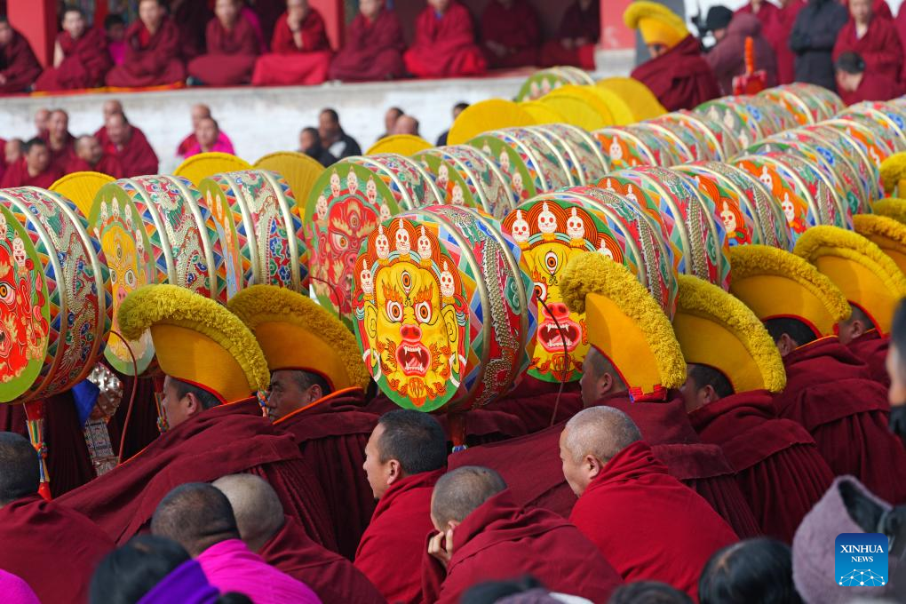 This photo taken on March 2, 2026 shows an event of exorcism dance at the Labrang Monastery in Xiahe County, northwest China's Gansu Province. The annual event of exorcism dance to pray for good luck in the new year was held here on Monday. Built in 1709, Labrang Monastery is one of the six great monasteries of the Gelug Sect of Tibetan Buddhism. (Xinhua/Liu Keying)