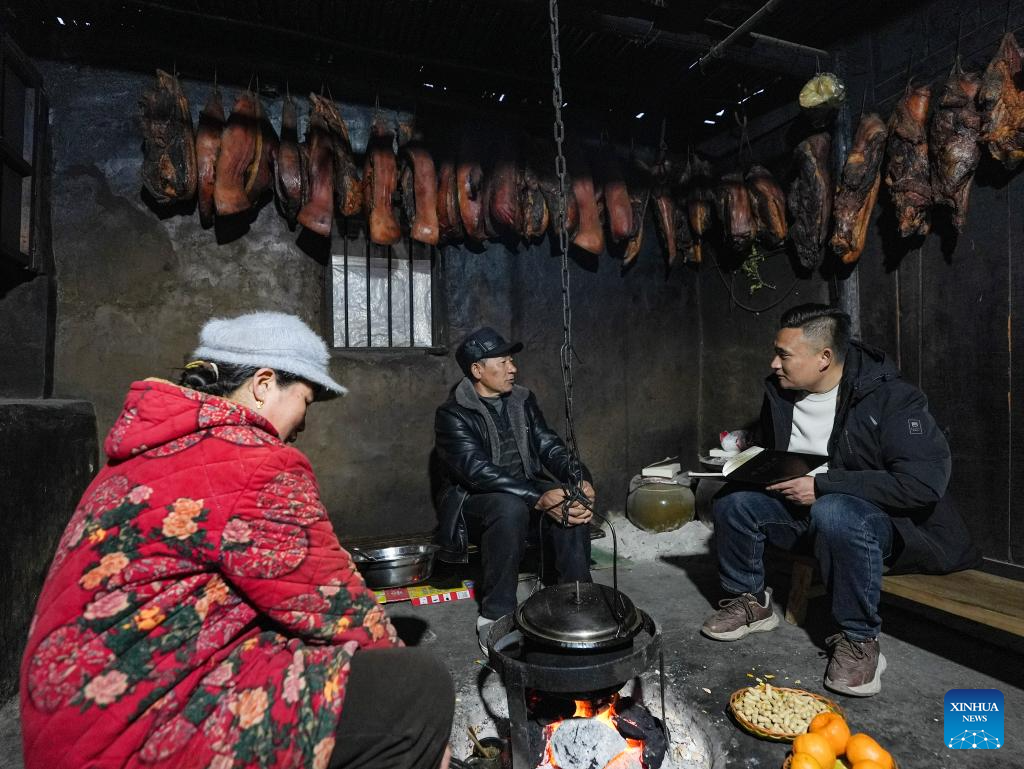 Zheng Wangchun (R) talks with the owner of a homestay in Gulu Village of Hanyuan County, southwest China's Sichuan Province, Jan. 29, 2026.(Xinhua/Wang Xi)