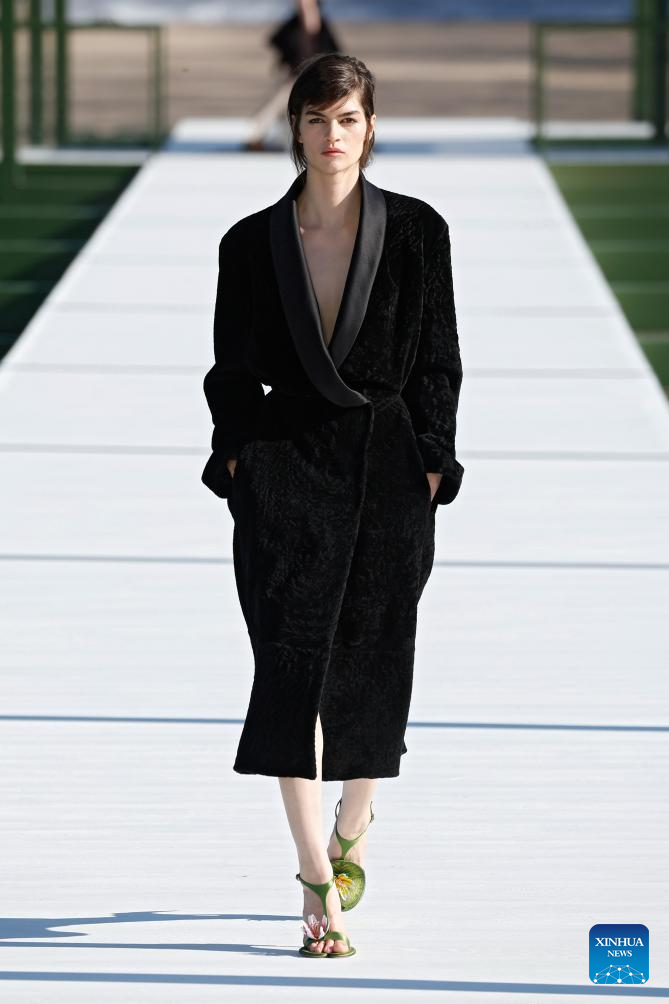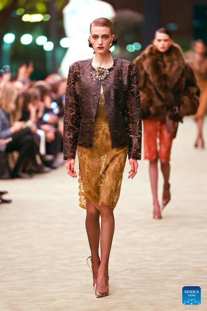 A model presents a creation from the ready-to-wear Fall/Winter 2026-2027 collections by Saint Laurent during the Paris Fashion Week in Paris, France, on March 3, 2026. (MeetEurope/Handout via Xinhua)
