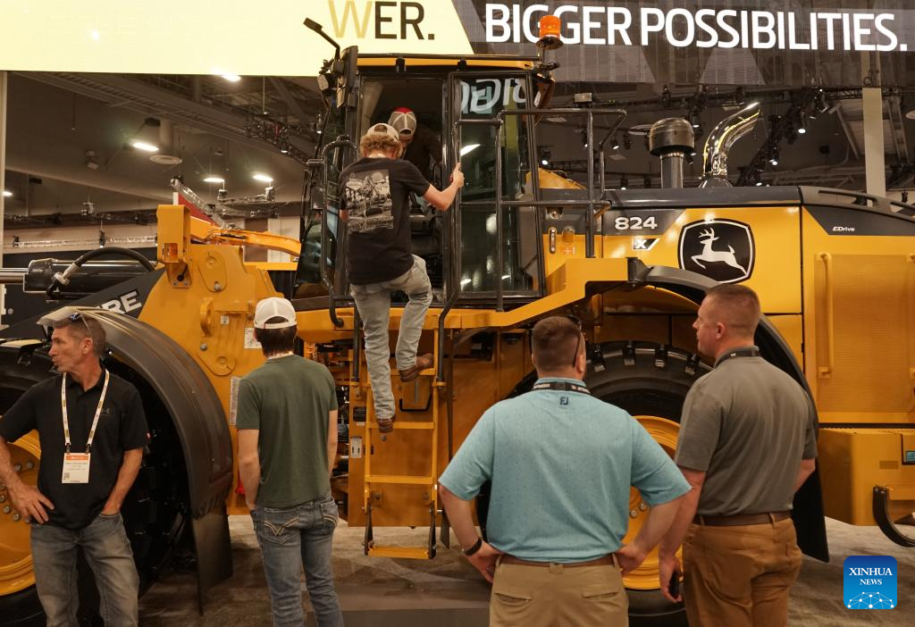 People visit the John Deere booth at the 2026 CONEXPO-CON/AGG in Las Vegas, the United States, on March 4, 2026. Global construction equipment manufacturers are gathering in Las Vegas from Tuesday to Saturday for the 2026 CONEXPO-CON/AGG, showcasing a broad shift toward artificial intelligence (AI) and autonomous operations. (Photo by Zeng Hui/Xinhua)