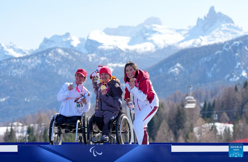 Anna-Lena Forster (C) of Germany, Audrey Pascual Seco (L) of Spain, Liu Sitong of China pose during awarding ceremony for the para alpine skiing women's downhill sitting match at the Milan-Cortina 2026 Paralympic Winter Games in Cortina D'ampezzo, Italy, March 7, 2026. (Xinhua/Wang Kaiyan)