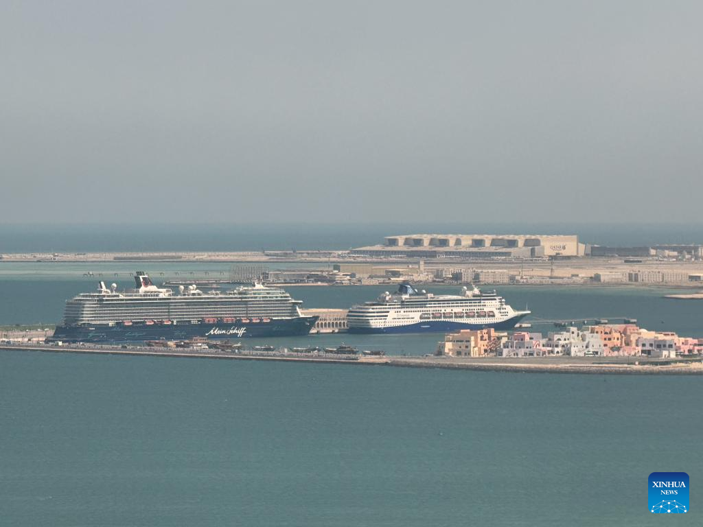 Passengers on board were originally scheduled to disembark and catch flights back home. However, due to the closure of airspace across the Gulf, major airlines have canceled flights to and from the region, leaving the passengers stranded on the ship and unable to leave Doha. (Xinhua/Wang Qiang)