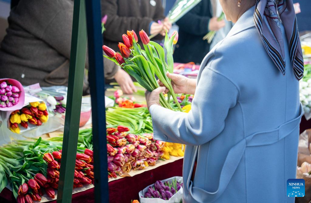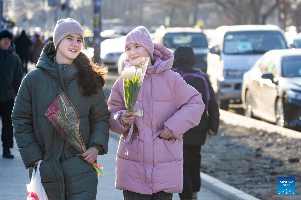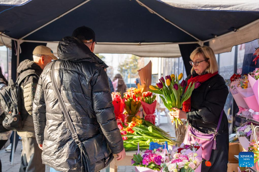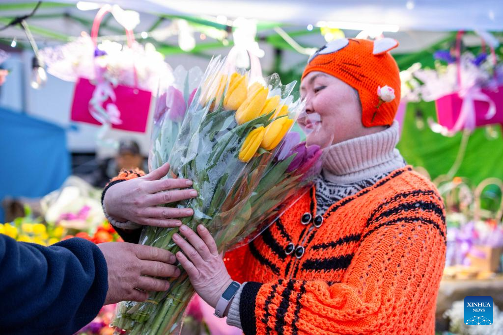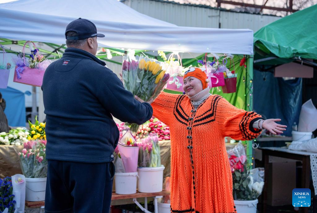 People buy flowers at a flower market in Almaty, Kazakhstan, March 7, 2026. Sunday marks International Women's Day. (Str/Xinhua)