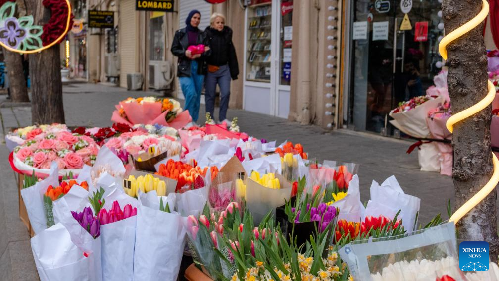 Pedestrians walk past a flower stall in Baku, Azerbaijan, March 7, 2026. Sunday marks International Women's Day. (Xinhua/Chen Junfeng)