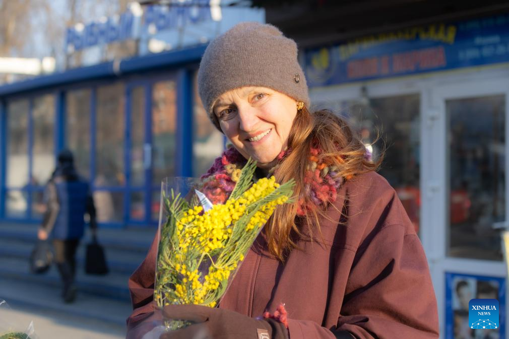 A woman shows a bunch of flowers in Vladivostok, Russia, March 7, 2026. Sunday marks International Women's Day. (Photo by Andrey Matveenko/Xinhua)