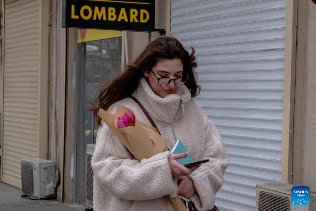 A woman walks with bunches of flowers in Baku, Azerbaijan, March 7, 2026. Sunday marks International Women's Day. (Xinhua/Chen Junfeng)