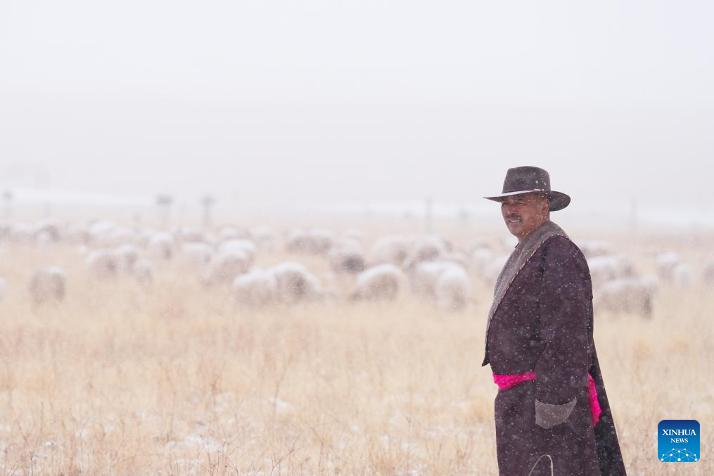 A shepherd herds livestock in the snow in Qilian County of Haibei Tibetan Autonomous Prefecture, northwest China's Qinghai Province, March 8, 2026. (Xinhua/Zhang Long)