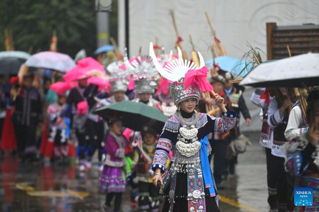 People attend a fair celebrating the "pohui" festival in a Miao ethnic village of Rongshui Miao Autonomous County, Liuzhou City, south China's Guangxi Zhuang Autonomous Region, March 7, 2026.