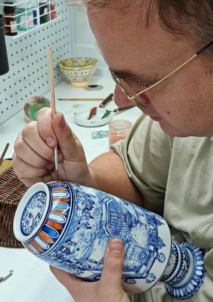 As for porcelain creation, Ribalta has expertly fused Spanish heritage with Chinese artistry, drawing inspiration from the black-and-white ceramic designs of his hometown, Barcelona. He employs traditional blue-and-white porcelain techniques to craft distinctive works that seamlessly blend Eastern and Western artistic styles.