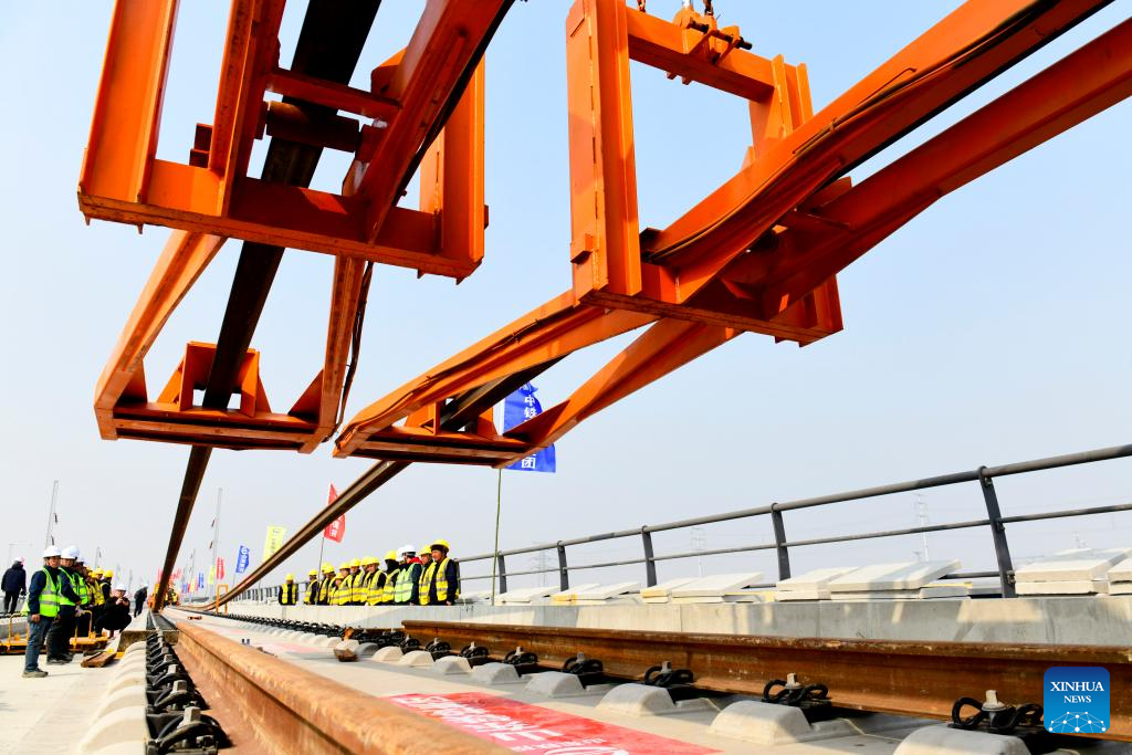 Staff members lay tracks at Binzhou railway station of the Jinan-Binzhou high-speed railway in Binzhou City, east China's Shandong Province, on March 10, 2026. The high-speed railway, which links the province's cities of Jinan and Binzhou and with a designed speed of 350 km/h, has officially entered the full-line track-laying operation phase on Tuesday. (Xinhua/Guo Xulei)