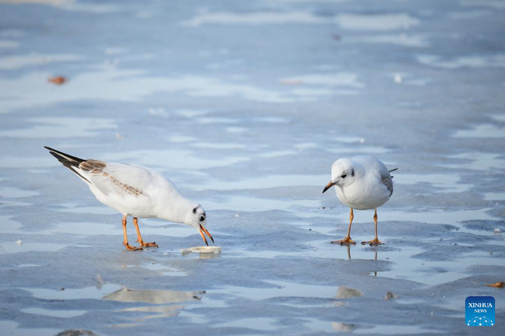 Seagulls forage on thin ice on a lake at the Lazienki Park in Warsaw, Poland on March 10, 2026. (Photo by Jaap Arriens/Xinhua)