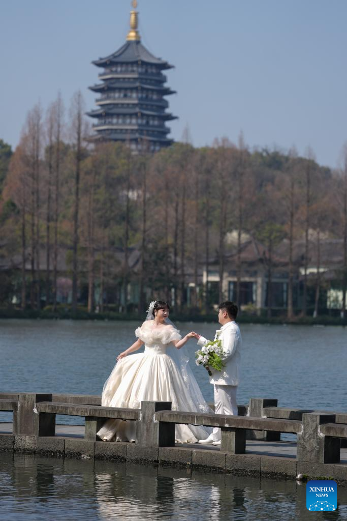 A couple pose for wedding photos at the West Lake scenic area in Hangzhou, east China's Zhejiang Province, on March 11, 2026. (Xinhua/Huang Zongzhi)