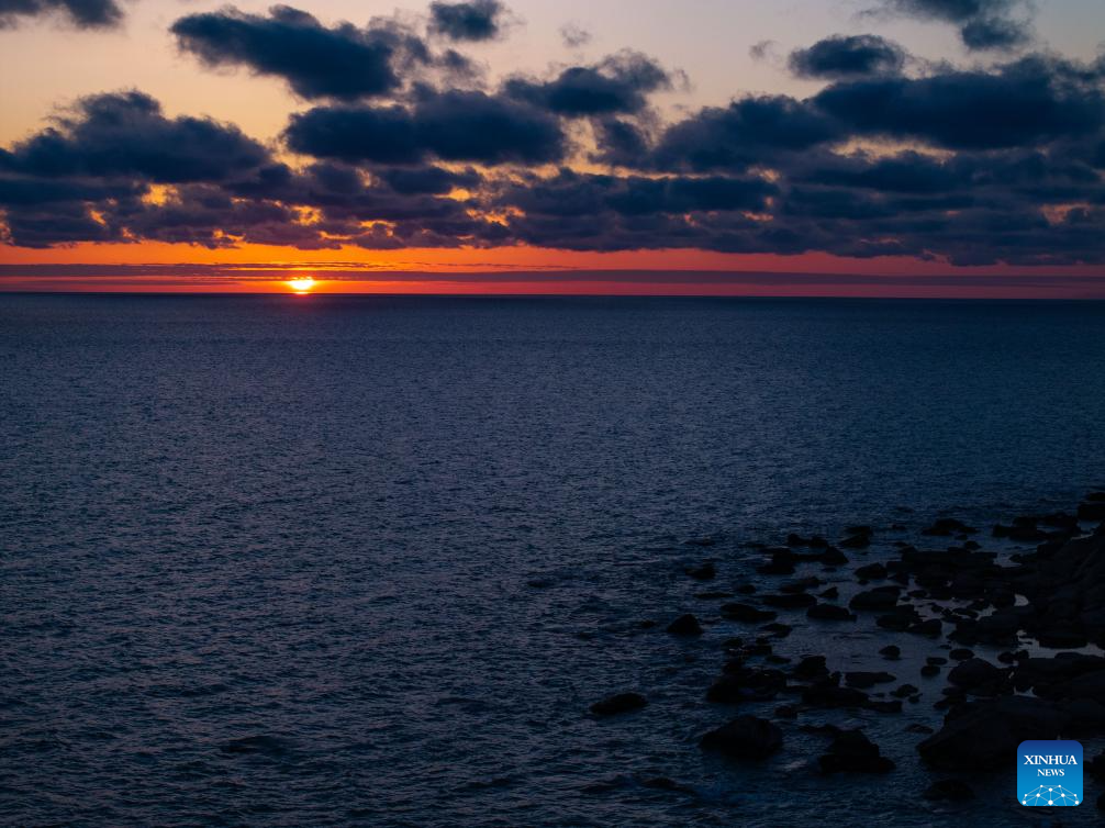 An aerial drone photo taken on March 10, 2026 shows a view of the Caspian Sea at sunset in Aktau, Kazakhstan. (Xinhua/Li Renzi)