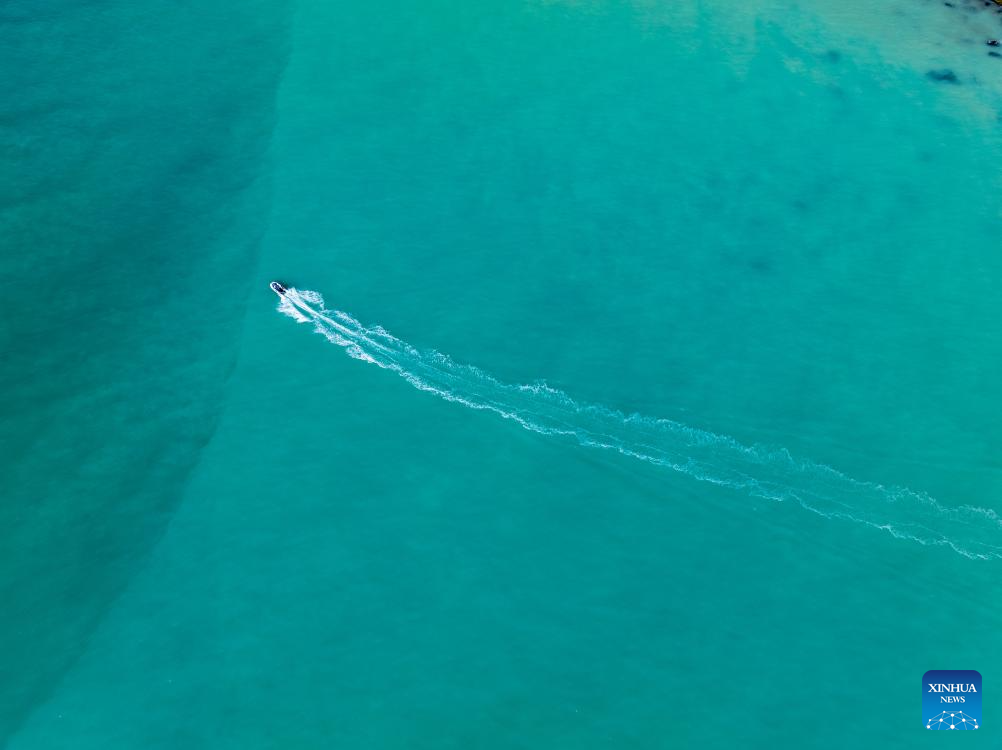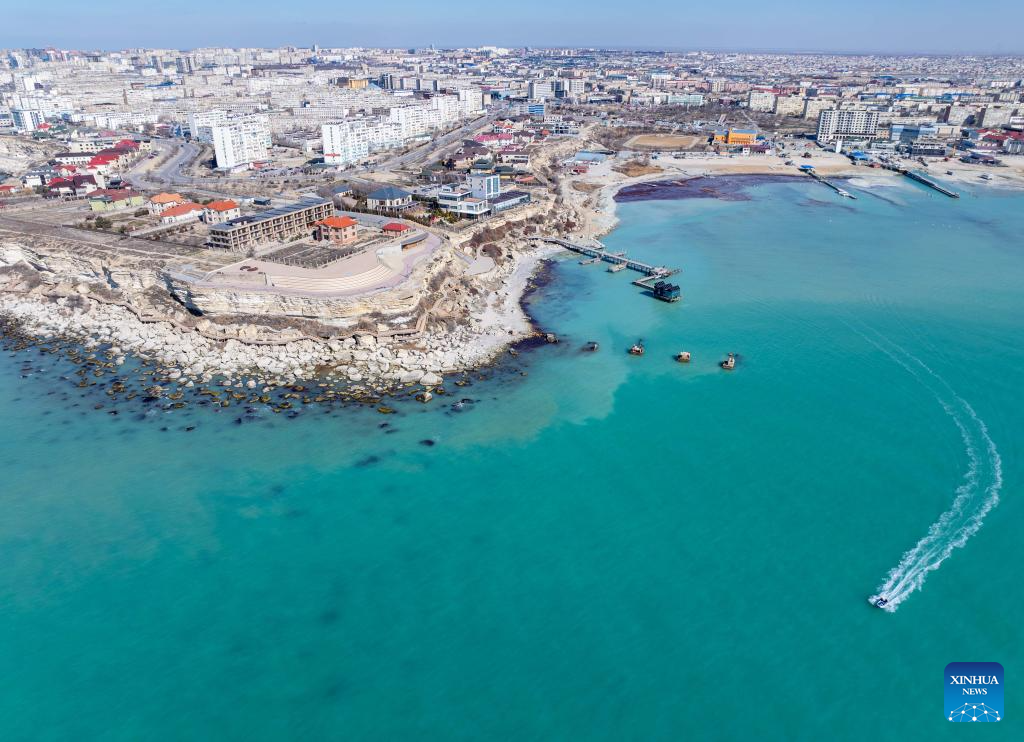 An aerial drone photo taken on March 10, 2026 shows a coast scenery of the Caspian Sea in Aktau, Kazakhstan. (Xinhua/Li Renzi)