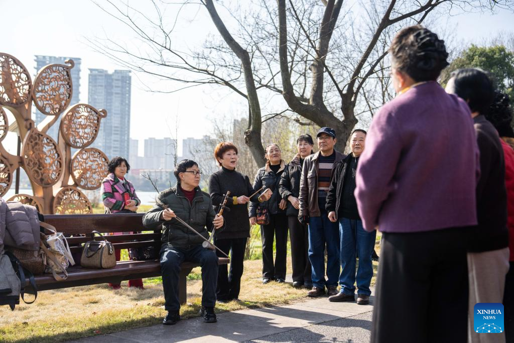 Seniors chorus at a community along the Chuanzi River in Changde, central China's Hunan Province, March 11, 2026.