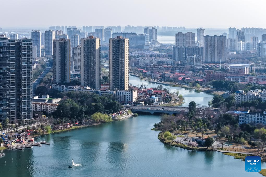 An aerial drone photo taken on March 11, 2026 shows the cityscape along the Chuanzi River in Changde, central China's Hunan Province.