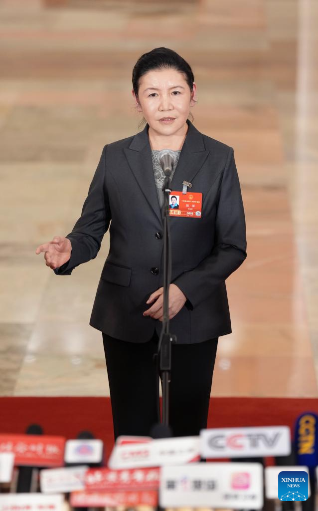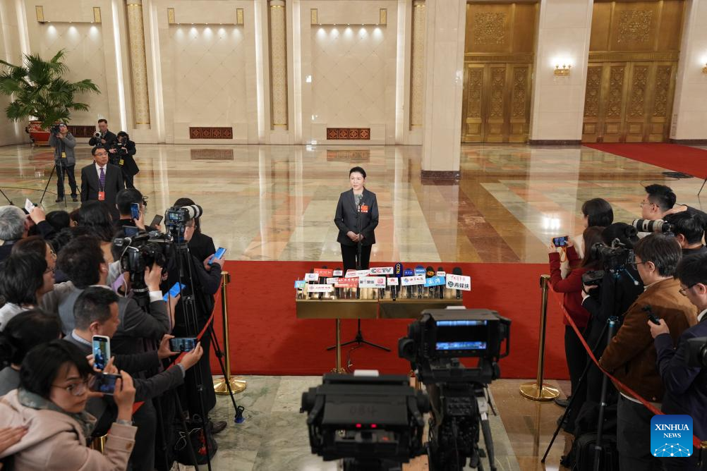 China's Minister of Justice He Rong gives an interview after the closing meeting of the fourth session of the 14th National People's Congress (NPC) at the Great Hall of the People in Beijing, capital of China, March 12, 2026. (Xinhua/Wang Xi)