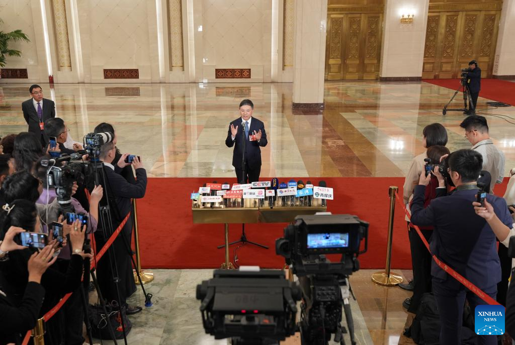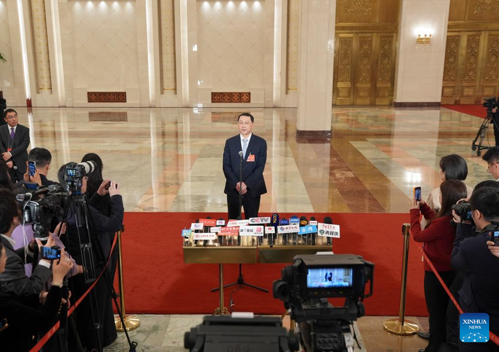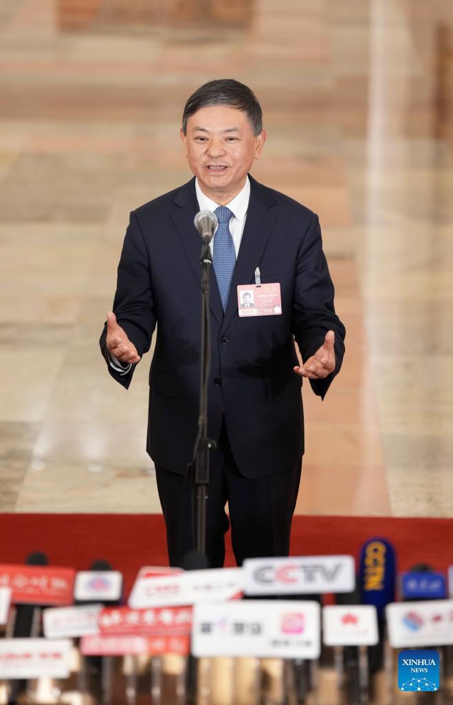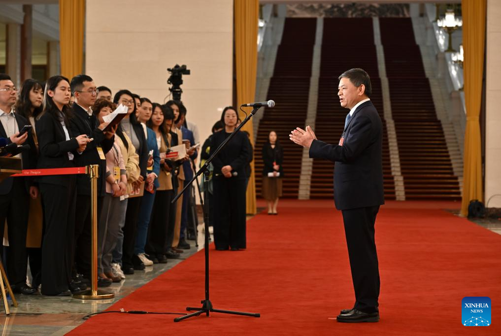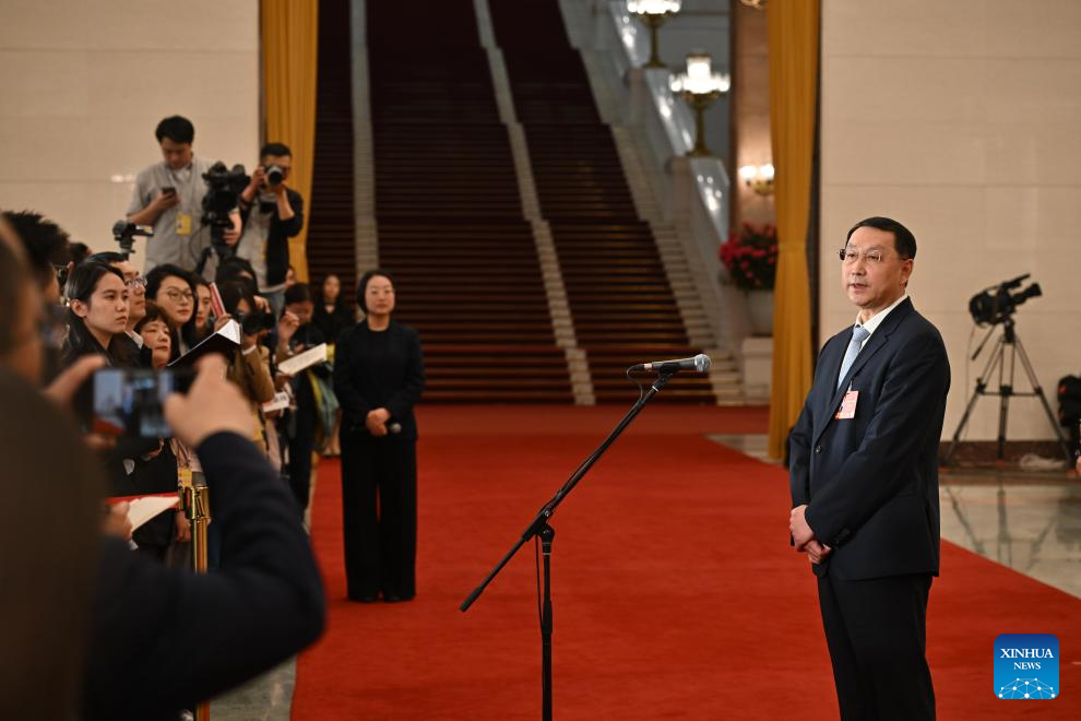 China's Minister of Natural Resources Guan Zhiou gives an interview after the closing meeting of the fourth session of the 14th National People's Congress (NPC) at the Great Hall of the People in Beijing, capital of China, March 12, 2026. (Xinhua/Wang Xi)