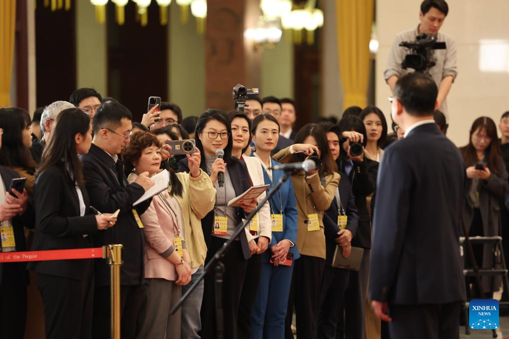 A journalist asks a question at an interview attended by ministers after the closing meeting of the fourth session of the 14th National People's Congress (NPC) at the Great Hall of the People in Beijing, capital of China, March 12, 2026. (Xinhua/Jin Liwang)