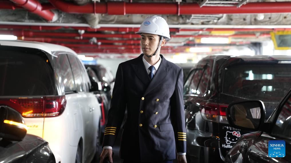 Ro-ro passenger ship captain Huang Wanli inspects the loading situation in the ship's vehicle deck in Haikou, south China's Hainan Province, Feb. 3, 2026. (Xinhua/Xu Yushen)