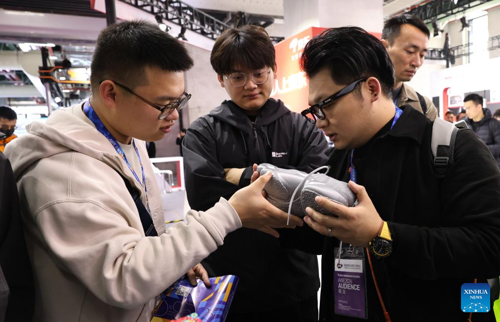 Visitors look at a 3D-printed shoe during the 2026 Appliance & Electronics World Expo (AWE2026) in east China's Shanghai, March 12, 2026. The AWE2026 kicked off in Shanghai on Thursday. More than 1,200 enterprises from all over the world gathered at the expo to showcase their latest innovations. (Xinhua/Fang Zhe)