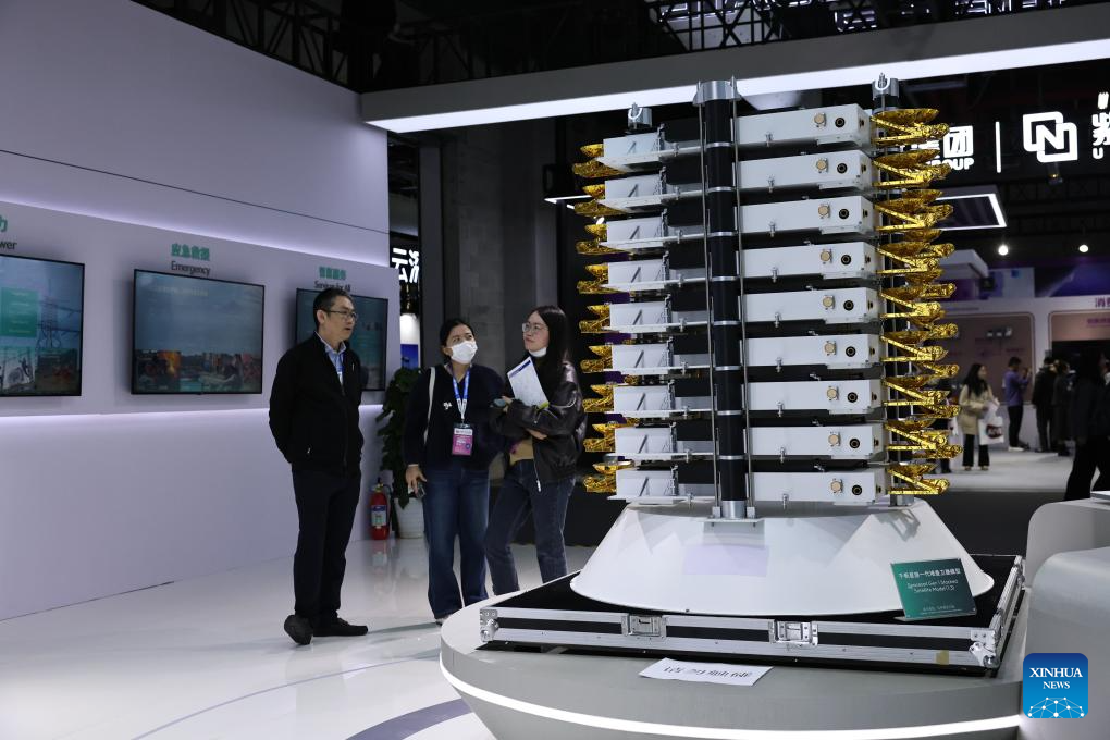 Visitors are pictured beside a model of stacked satellites during the 2026 Appliance & Electronics World Expo (AWE2026) in east China's Shanghai, March 12, 2026. The AWE2026 kicked off in Shanghai on Thursday. More than 1,200 enterprises from all over the world gathered at the expo to showcase their latest innovations. (Xinhua/Fang Zhe)