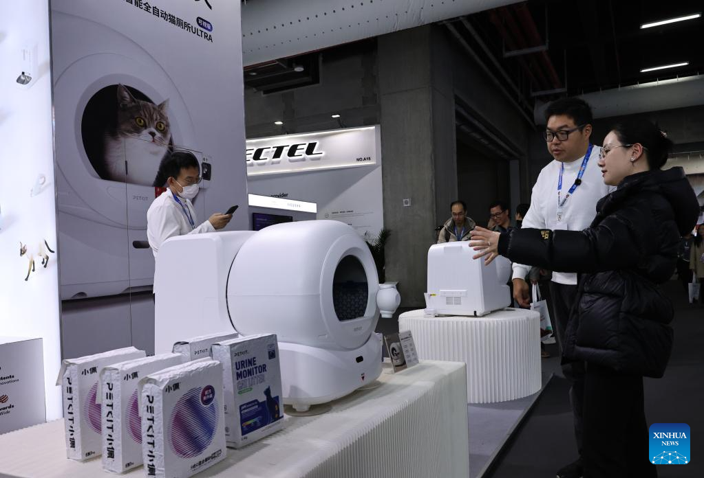 A visitor learns about a smart cat toilet during the 2026 Appliance & Electronics World Expo (AWE2026) in east China's Shanghai, March 12, 2026. The AWE2026 kicked off in Shanghai on Thursday. More than 1,200 enterprises from all over the world gathered at the expo to showcase their latest innovations. (Xinhua/Fang Zhe)