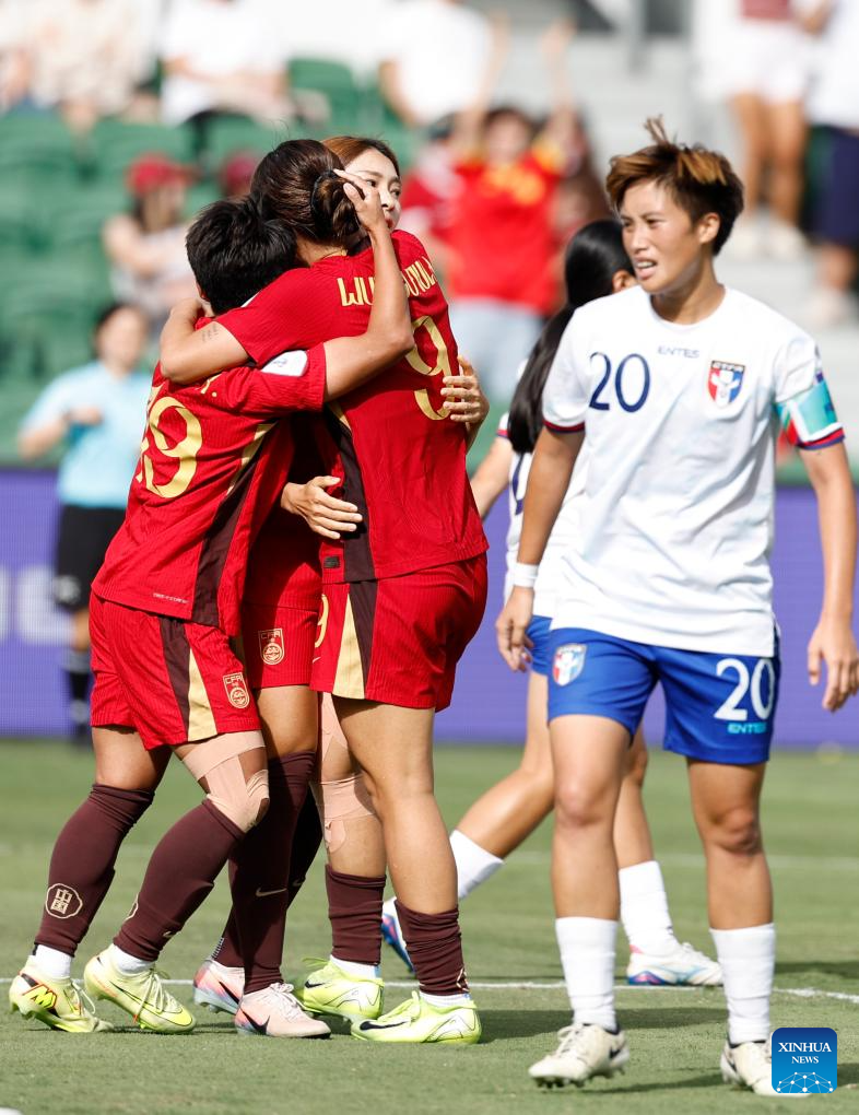 Players of China celebrate scoring during the quarterfinal of Women's Asian Cup between China and Chinese Taipei at Perth Rectangular Stadium in Perth, Australia, March 14, 2026. (Xinhua/Ma Ping)