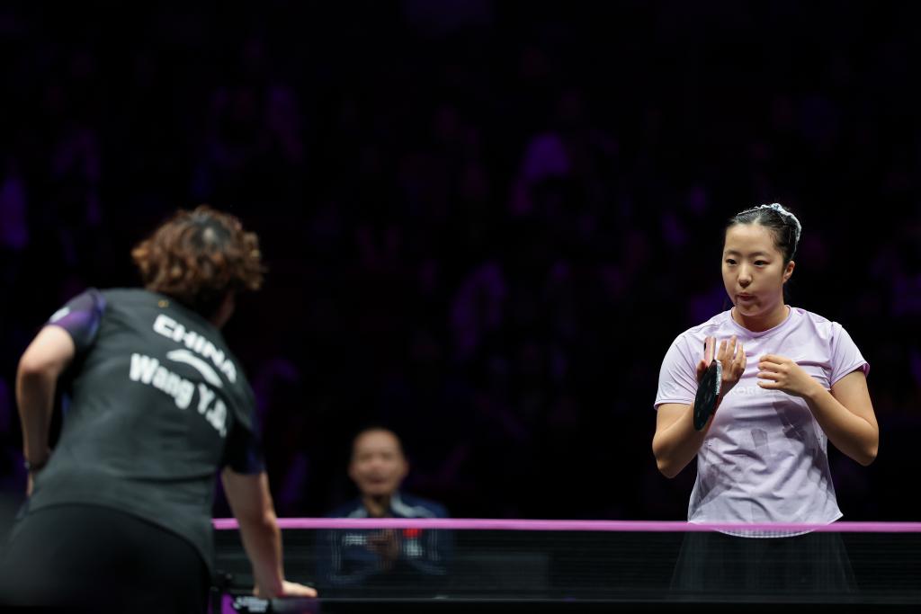 Shin Yubin (R) of South Korea reacts during the women's singles quarterfinal between Wang Yidi of China and Shin Yubin of South Korea at the WTT Champions Chongqing 2026 in southwest China's Chongqing, March 14, 2026. (Xinhua/Huang Wei)